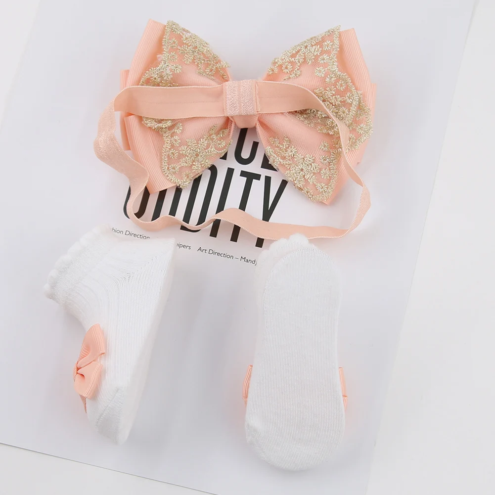 3Pcs/Set Solid Cotton Baby Non-Slip Socks Mini Ribbon Bow Boutique Gold Lace Elastic Hair Bands 0-12M Princess Girls Headwear