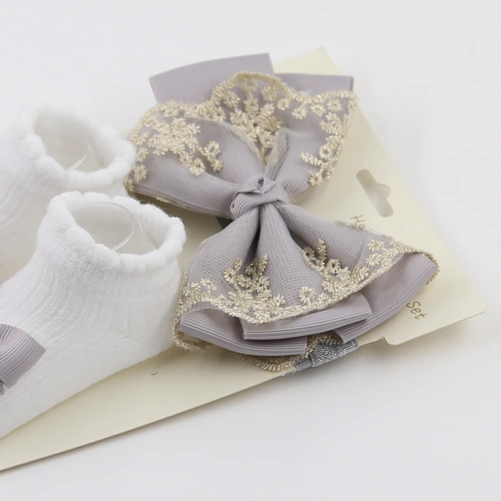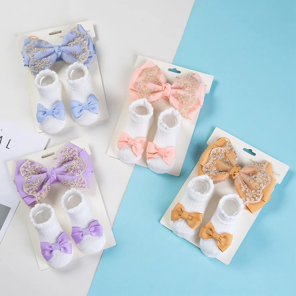 3Pcs/Set Solid Cotton Baby Non-Slip Socks Mini Ribbon Bows Boutique Gold Lace Elastic Hair Bands 0-12M Princess Girls Headwear