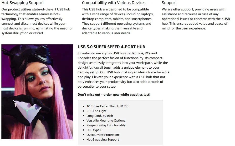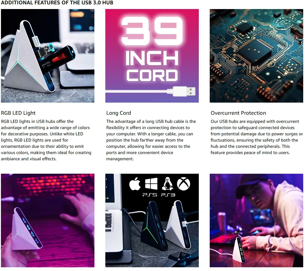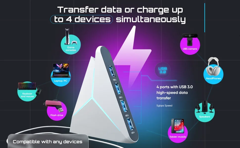 4 Ports USB 3.0 Docking Station 39inch Cable USB Hub 5Gbps LED Light USB &Type C Splitter Adapter for Laptop PC Keyboard Phone