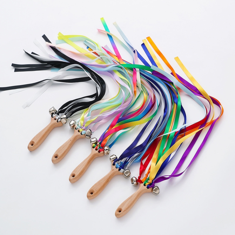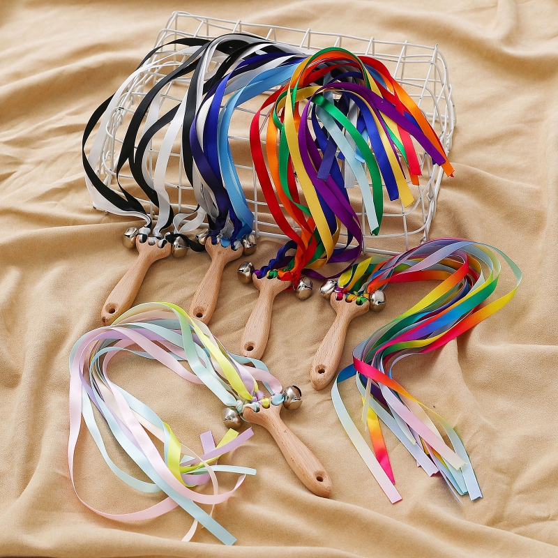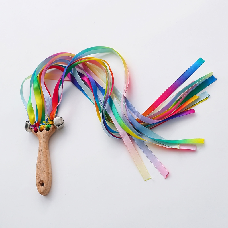 Baby Wooden Rattles with 50cm Rainbow Ribbon Kids Hand Kite Streamer with Bell Outdoor Toys Baby Sports Educational Toys Gifts