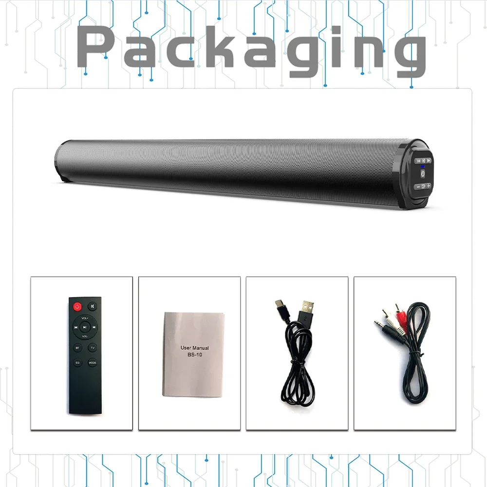 13.Accessories: charging cable, 3.5MM- RCA cable, remote control, manual 14.Support TV/PC/Phone/Tablet/Laptop/MP3/MP4/ DVD player/TV Box Audio