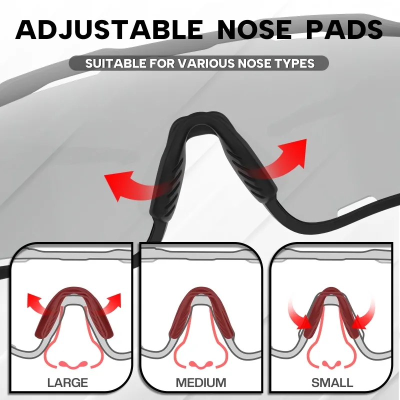 bike goggles use wide lenses which wrap a lot of your face , good protection up to the sides. anti-slip nose pad and adjustable arm length and rubber ear pad, which is comfort fit for different men's & women's head sizes