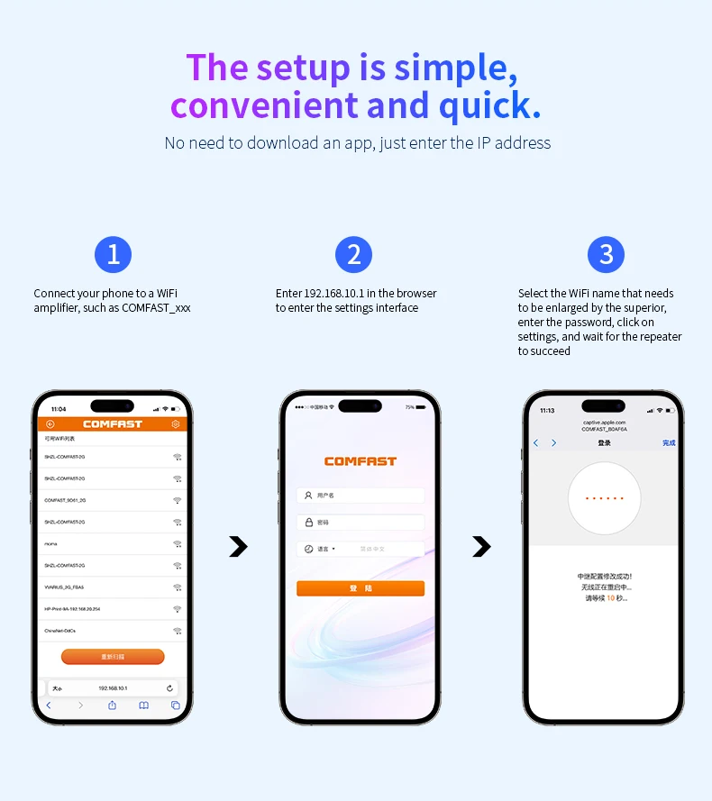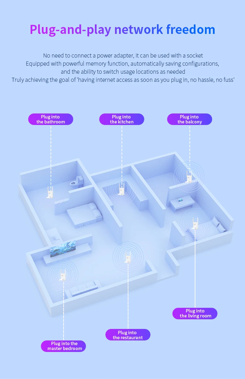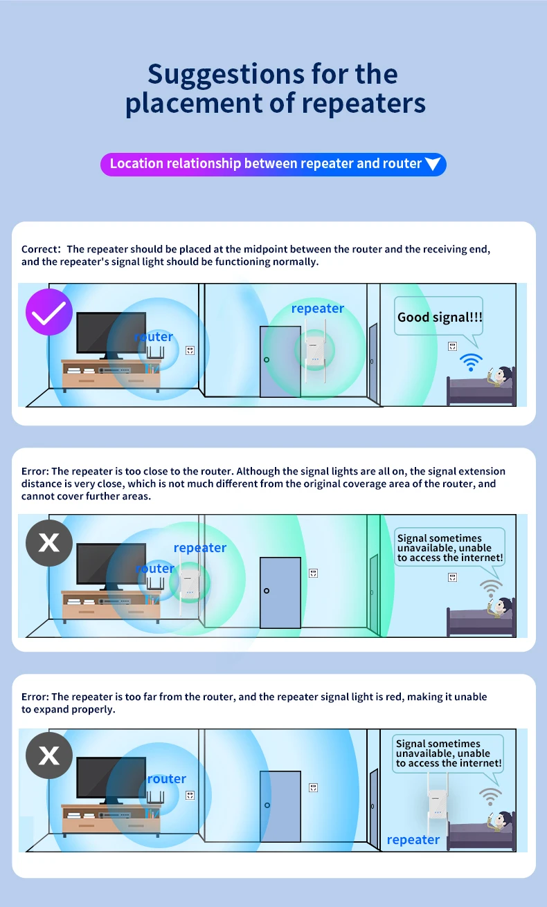 Note:About the signal,The repeater should be placed between the router and the distance to be transmitted, and it must be ensured that the repeater can receive the full signal before it can relay the signal well.