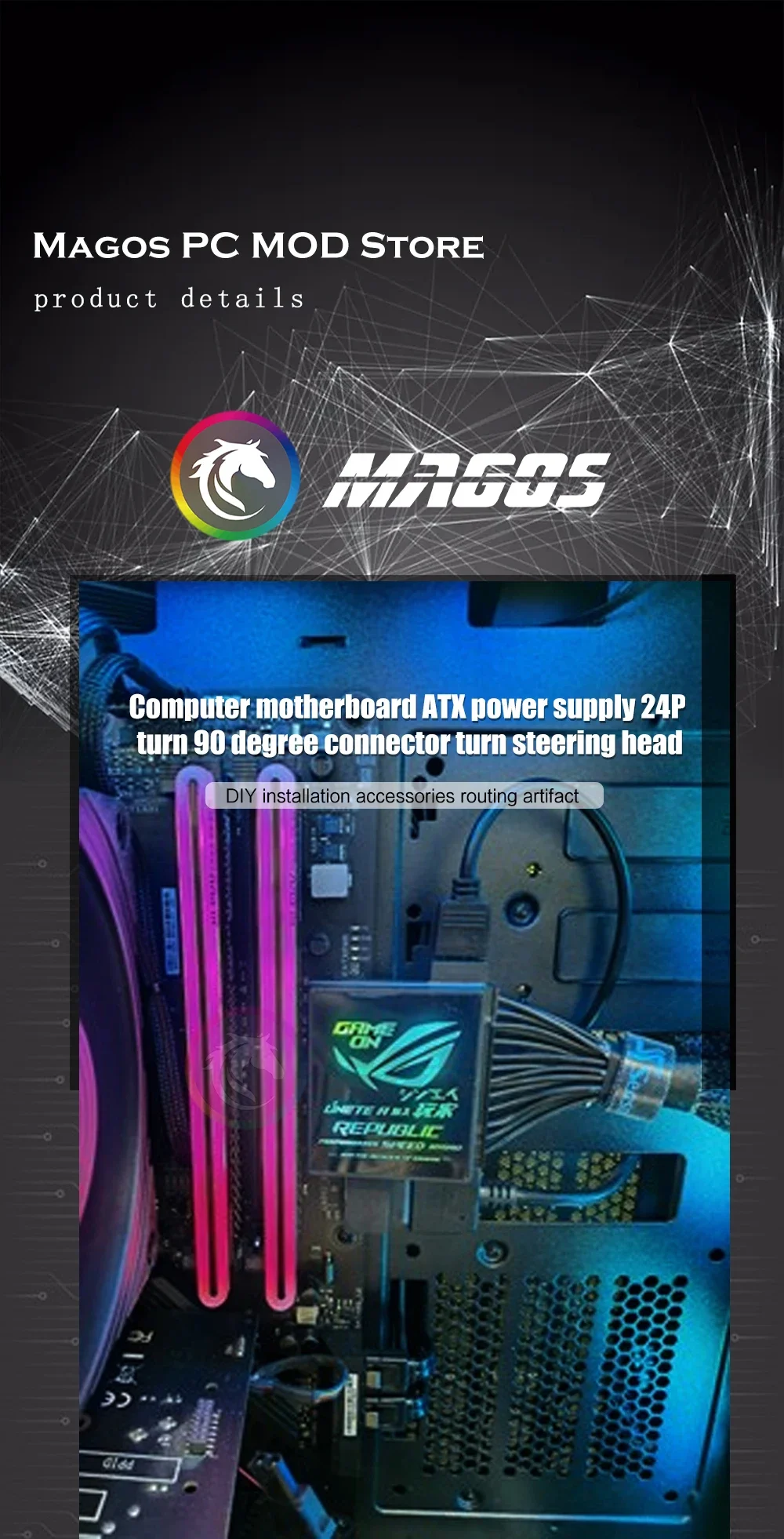 Computer Power Supply PSU ATX 24Pin Cable Adapter 90° Angle Connector, Wiring Management 5V ARGB Personalize Logos 12 Designs