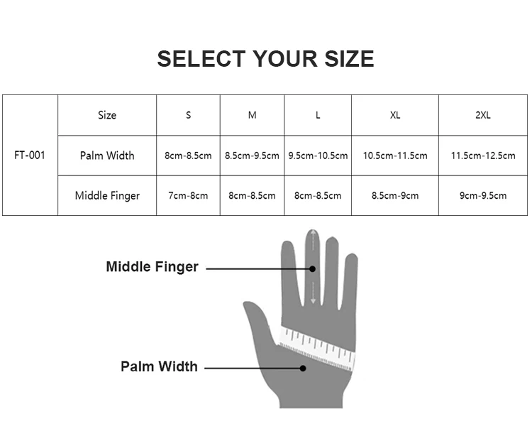 1. Please choose the appropriate size based on the palm width and middle finger length provided in the product specifications. Before placing an order, it is recommended to first measure the palm width and middle finger length (measured in CM), which is the best method.