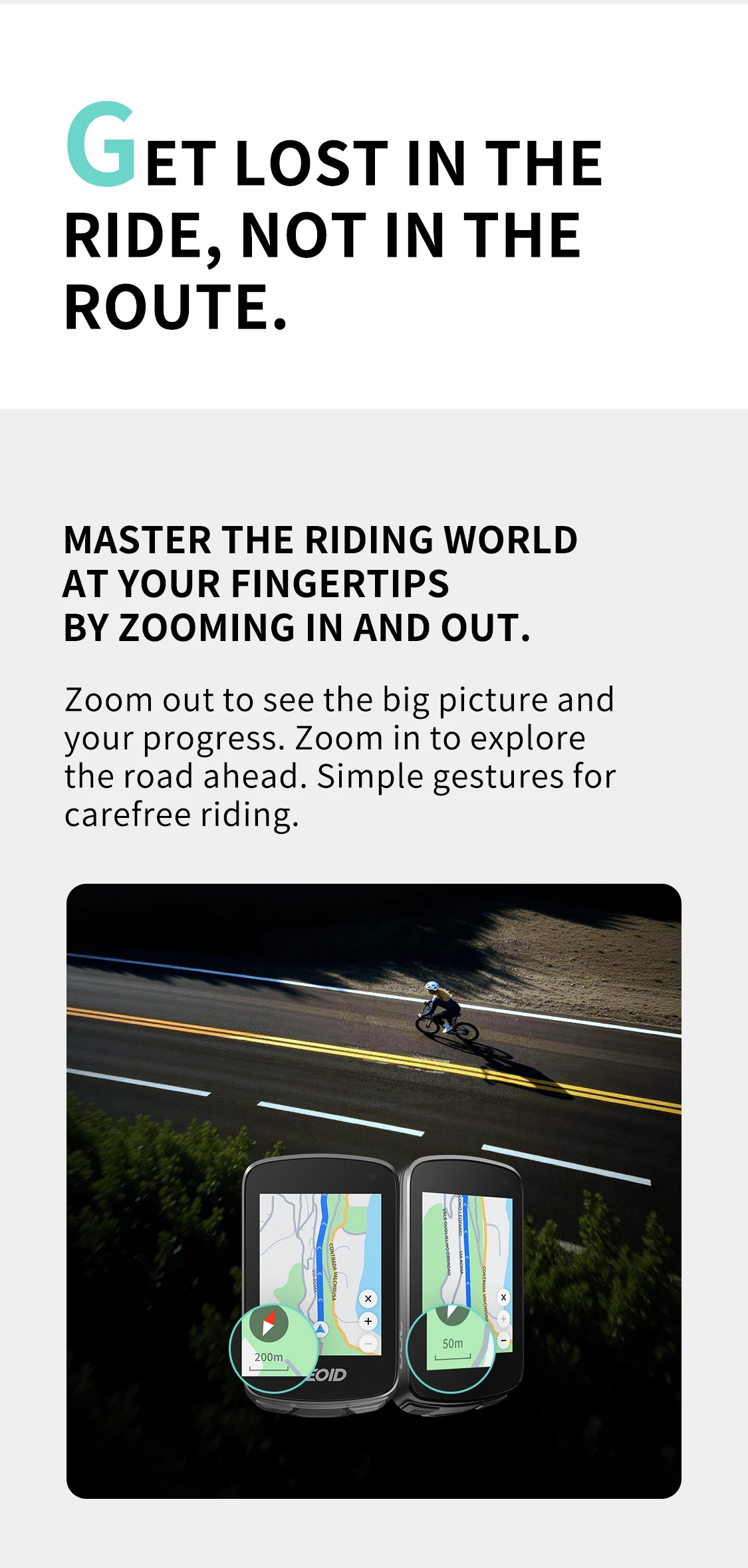 1.Zoom out to see the big picture and your progress. Zoom in to explore the road ahead. Simple gestures for carefree riding.