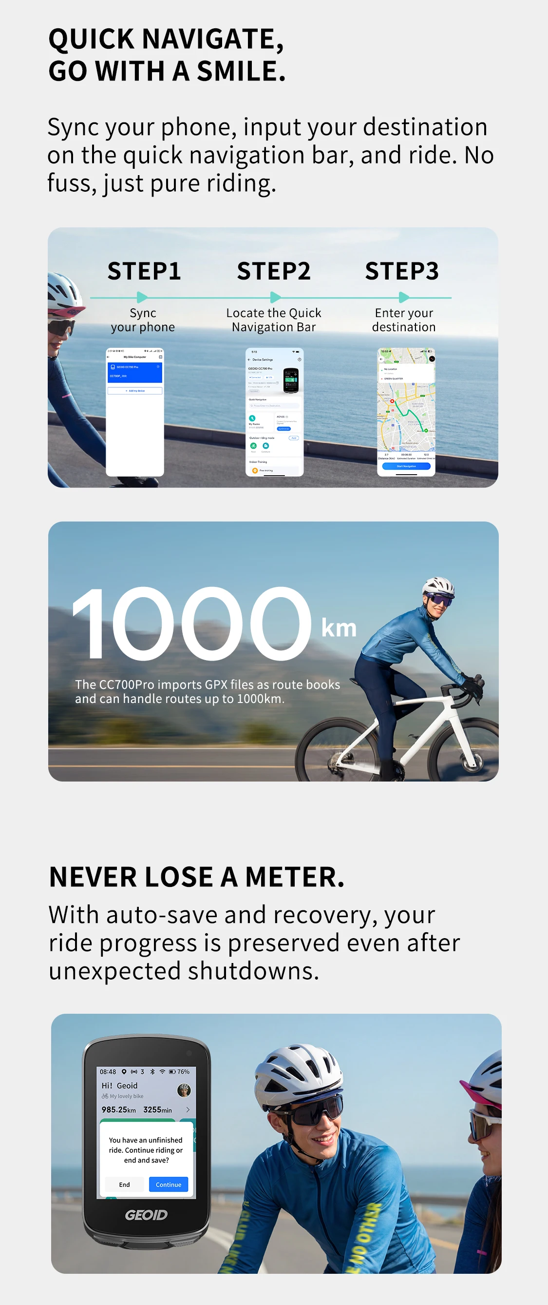 5.The CC700Pro imports GPX files as route books and can handle routes up to 1000km.