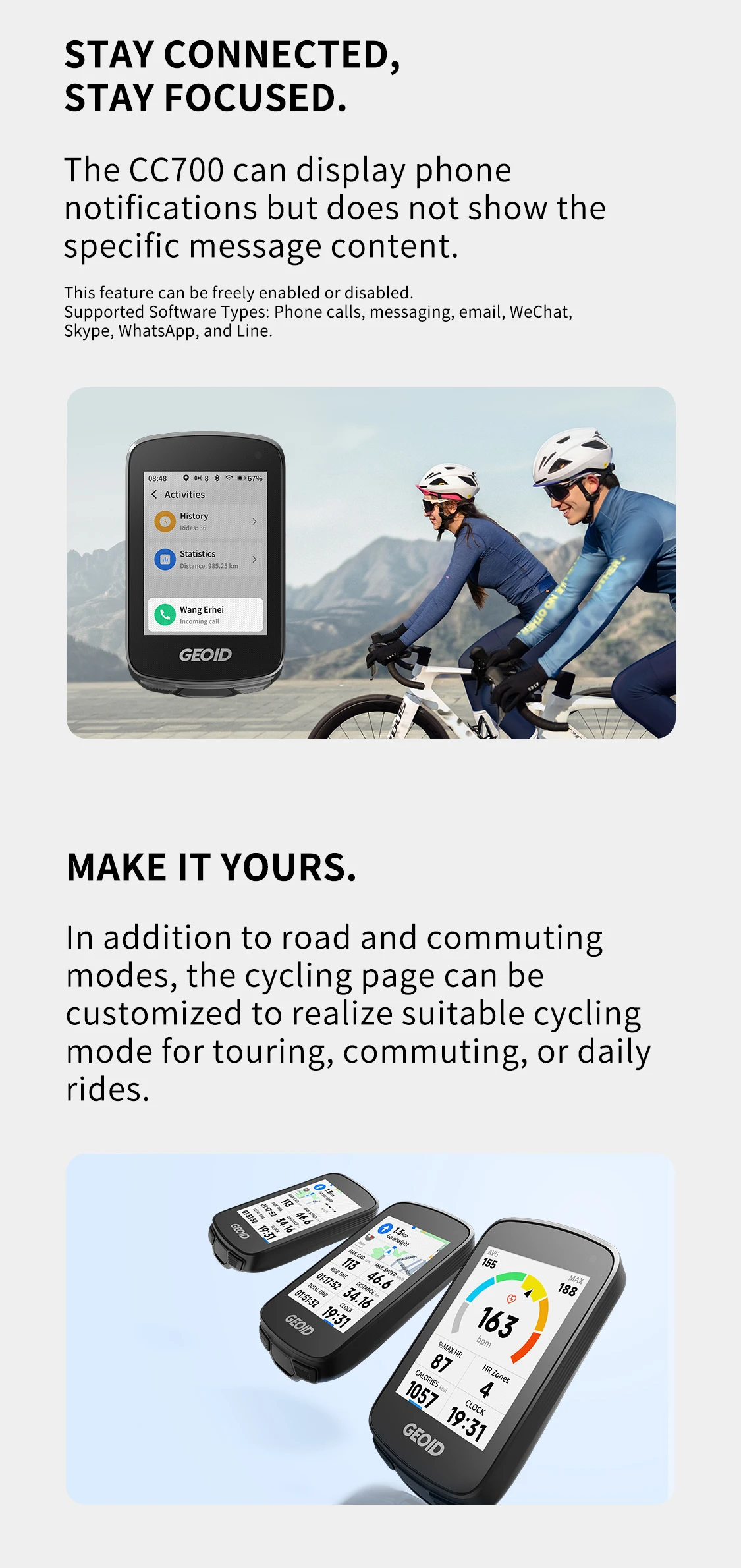 3.In addition to road and commuting modes, the cycling page can be customized to realize suitable cycling mode for touring, commuting, or daily rides.