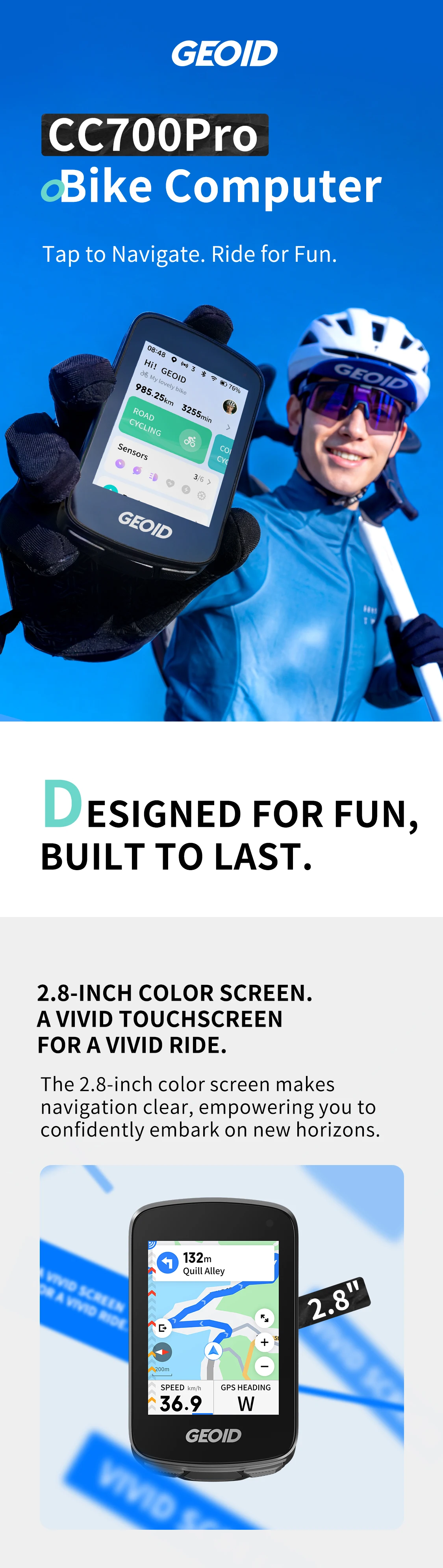 GEOID CC700 Pro Bicycle Computer GPS 2.8-Inch Touchscreen Bike Speedometer Global Map Navigation Cycling Odometer for Strava