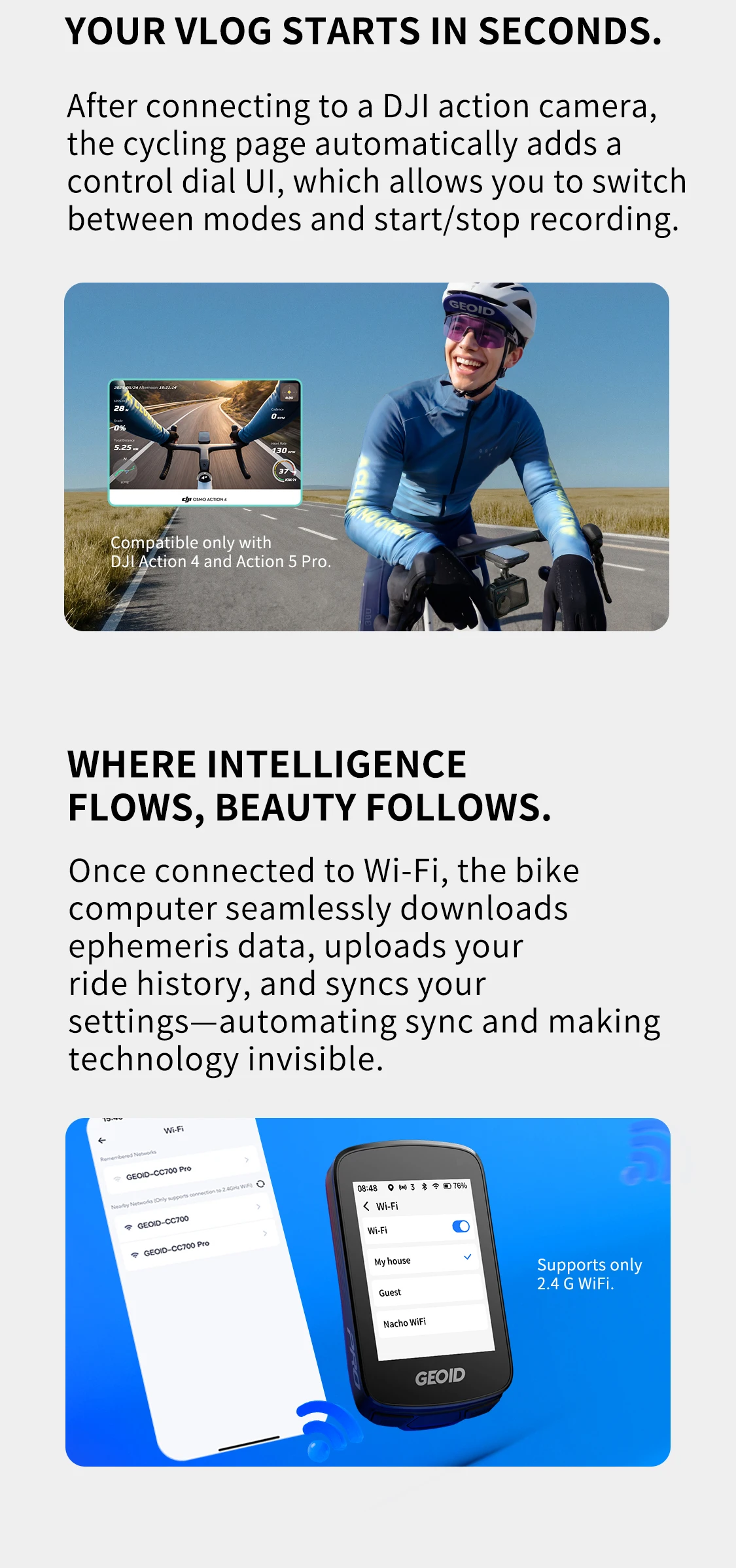 Once connected to Wi-Fi, the bike computer seamlessly downloads ephemeris data, uploads your ride history, and syncs your settings—automating sync and making technology invisible.