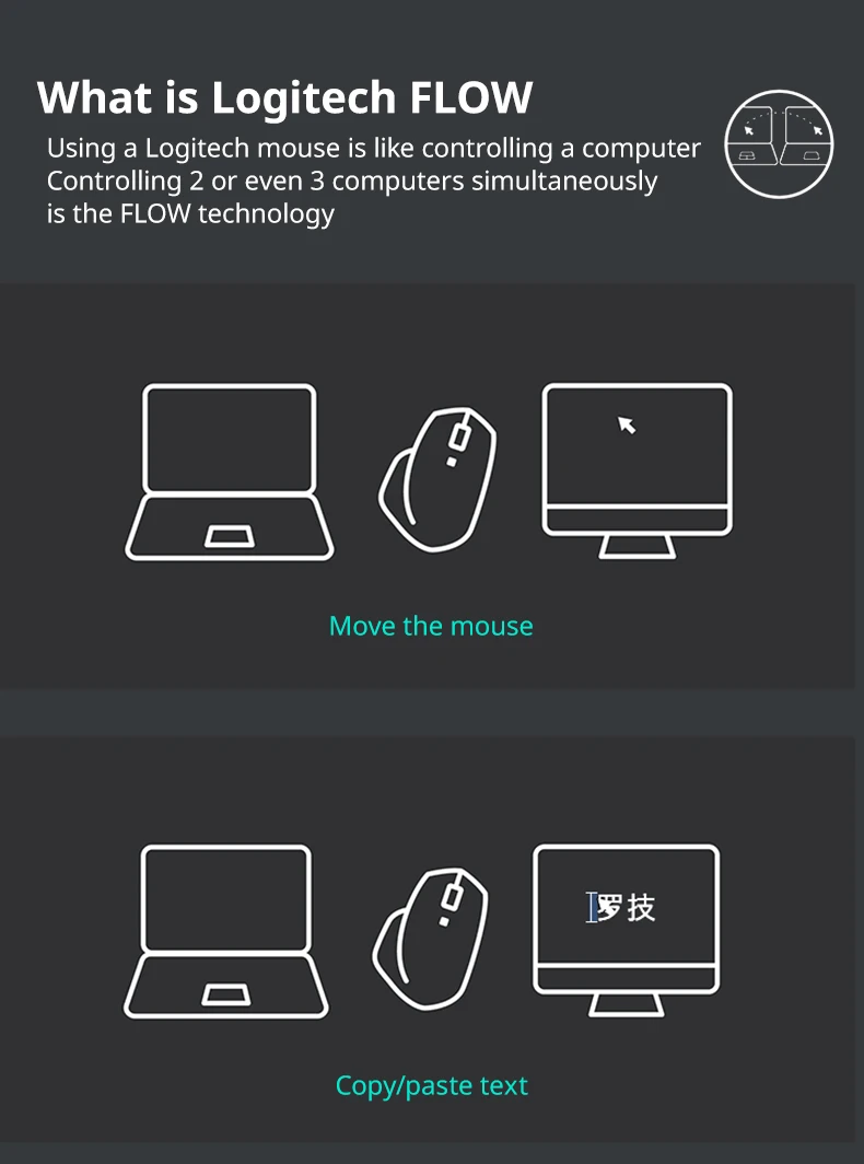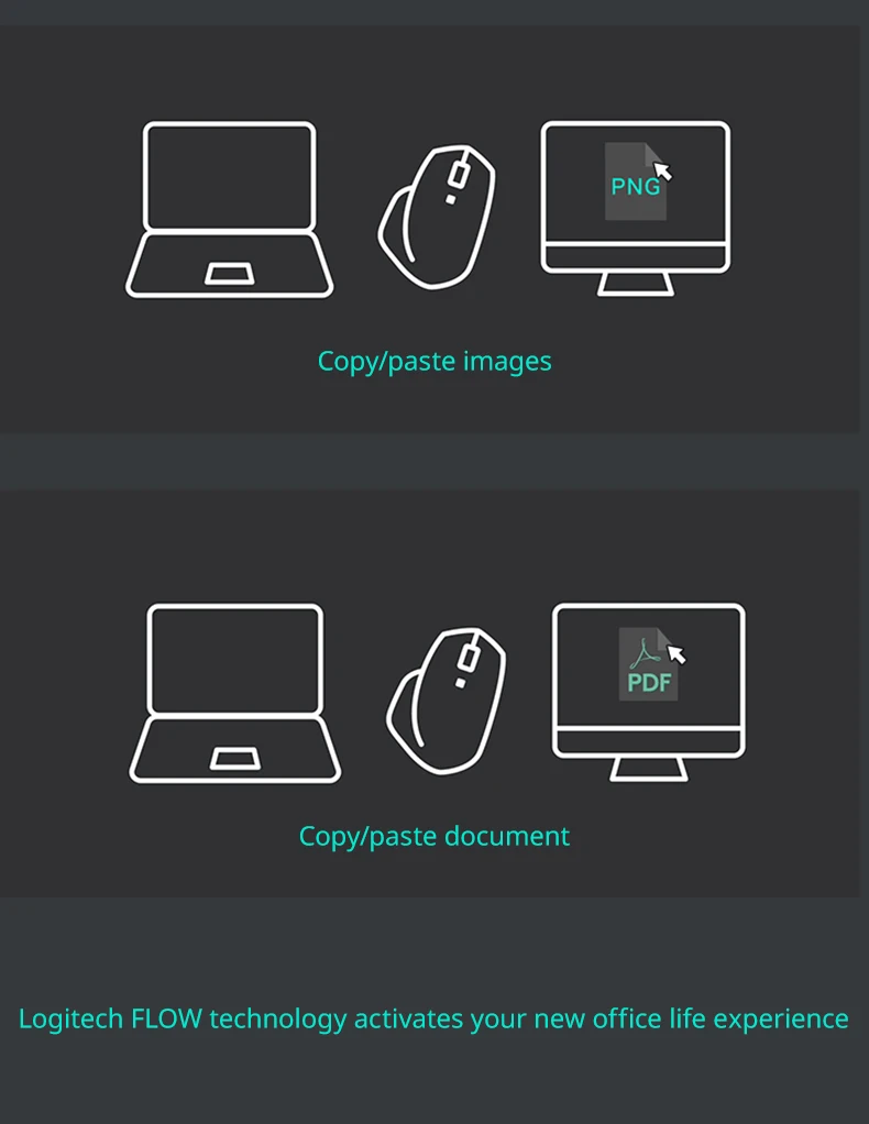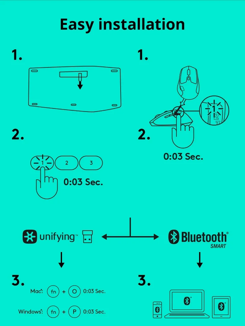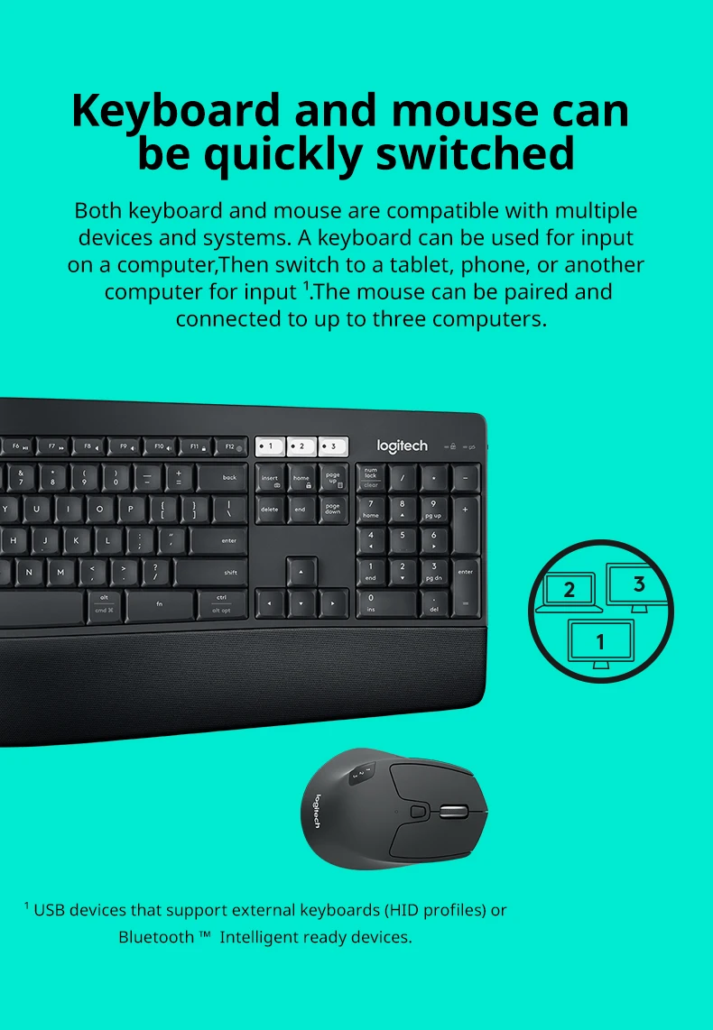 2. The keyboard and mouse fully support multiple devices and operating systems, and can be powered through the project. Start typing on your computer, then switch and input on your tablet, phone, or second computer. Pair the mouse with up to 3 screens. ¹ Any device equipped with USB or Bluetooth smart readiness, supporting an external keyboard (HID profile).