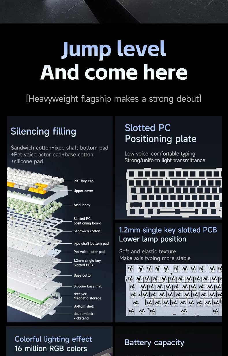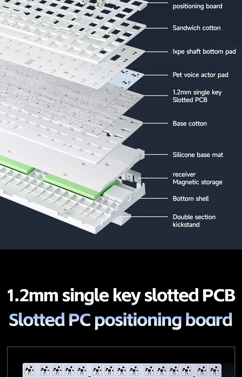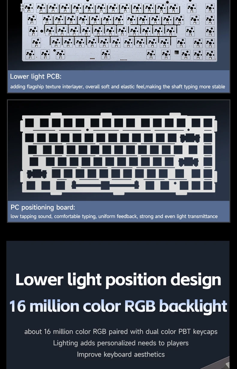 -Gasket-Mounted Structure: Featuring a 5-layer dampening system that ensures a quiet and satisfying typing feel, ideal for both typing and gaming.