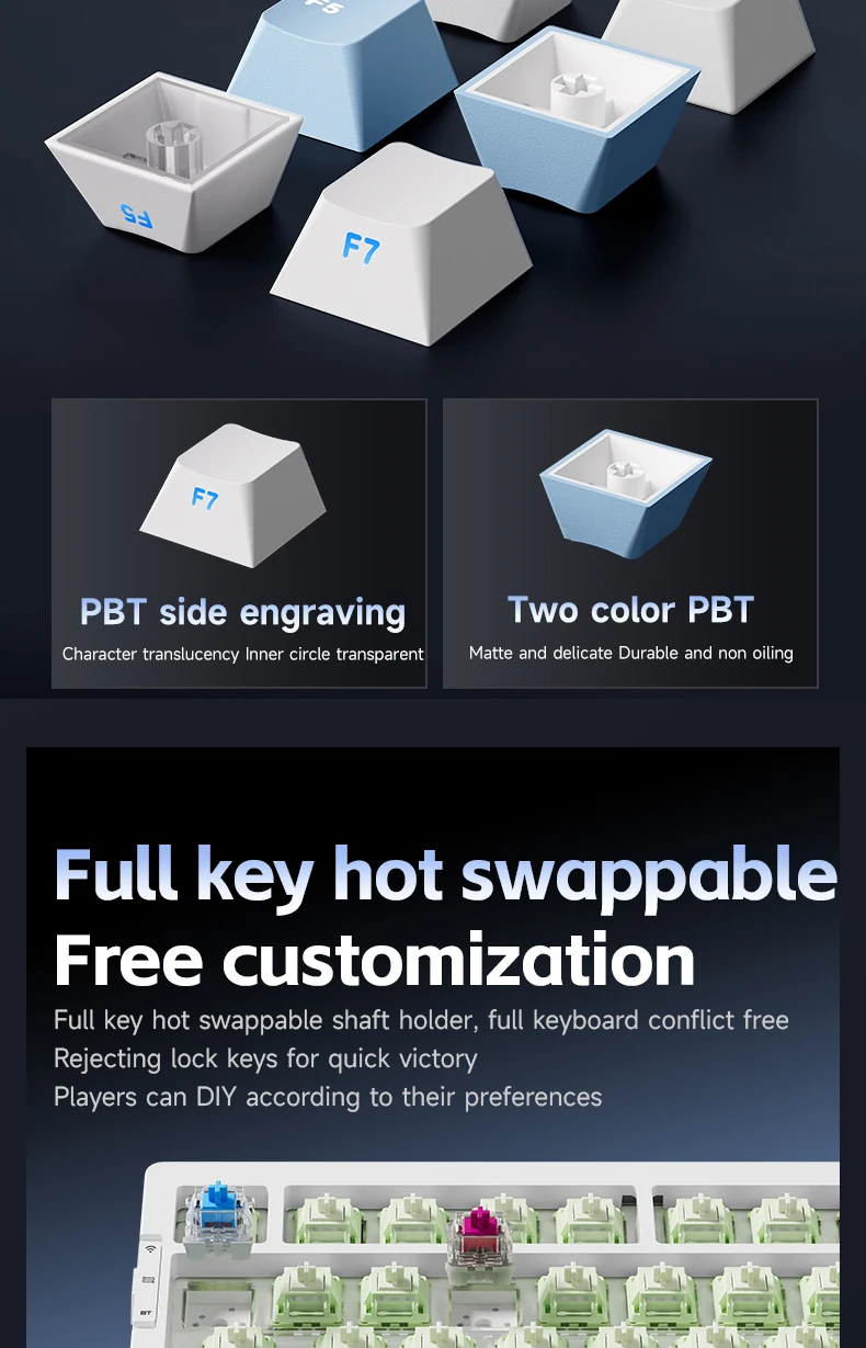 -Hot Swappable Keys: Customizable key switches with no soldering required, allowing you to personalize your typing experience.