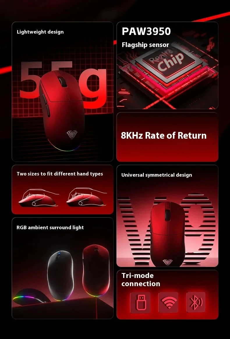 New Aula V9 Ultra Wireless E-sports Gaming Mouse Double 8k 3mode PAW 3950 8k Custom PC Accessory 55g Lightweight Ergonomic Mouse