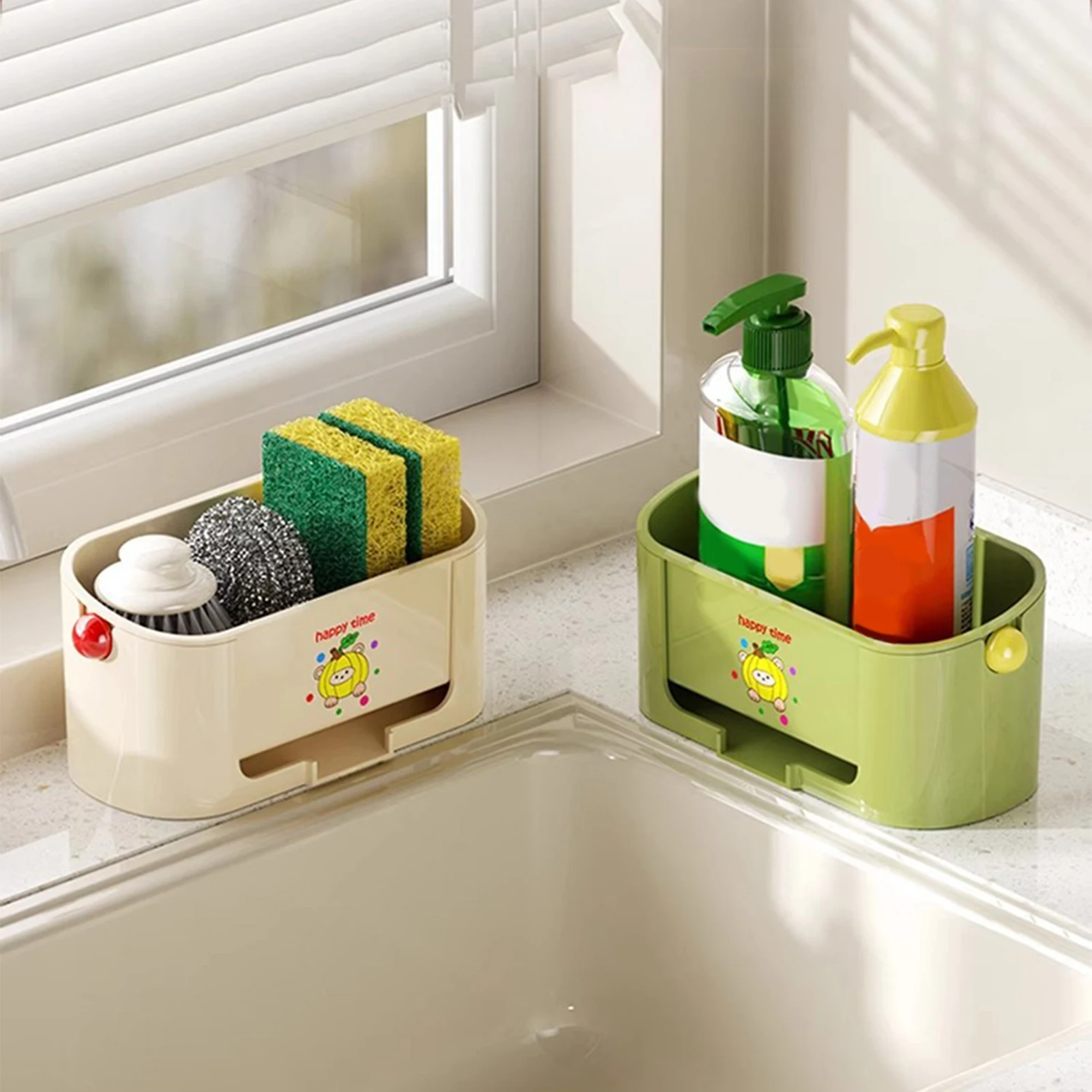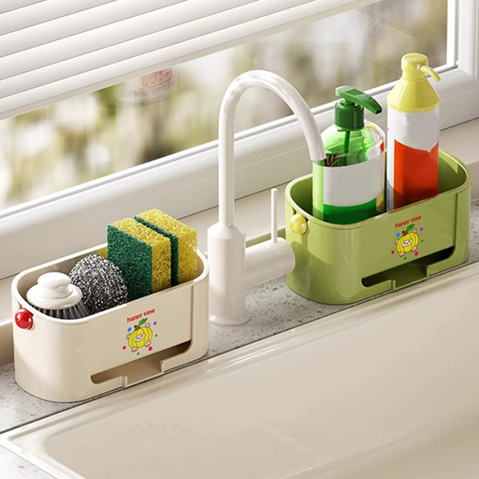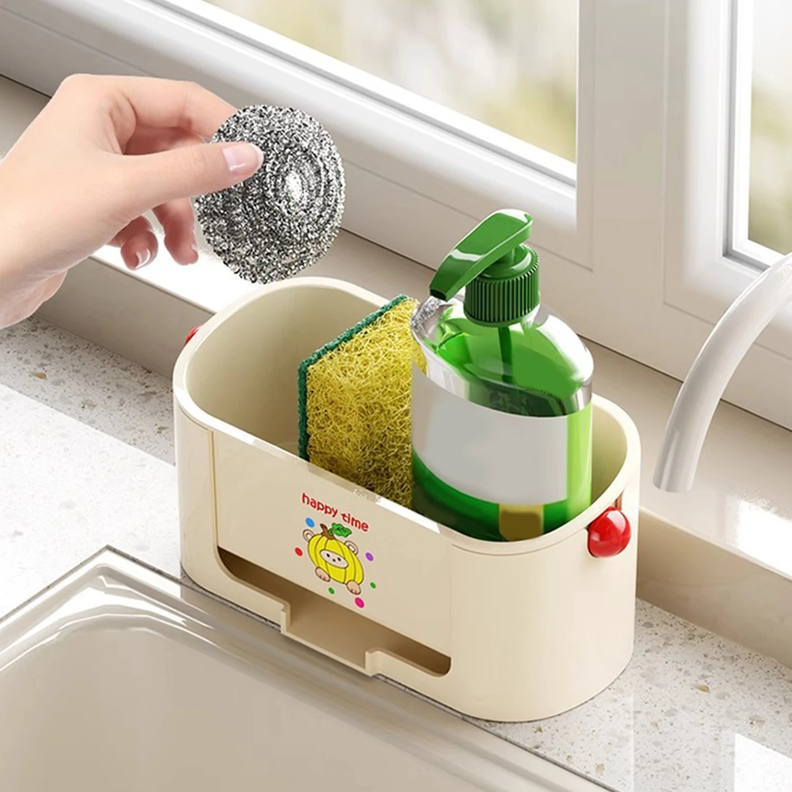 Self-Draining Base: Featuring a self-draining plastic sink caddy, this sponge holder ensures proper water drainage to prevent mold and mildew. The elevated design keeps items dry and hygienic for long-lasting use.