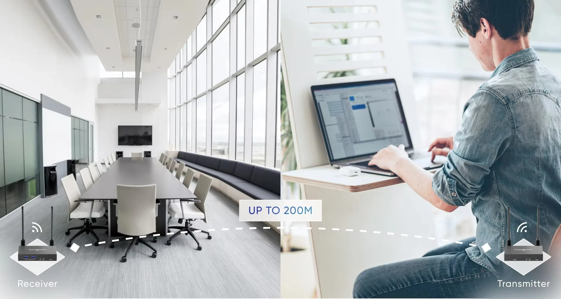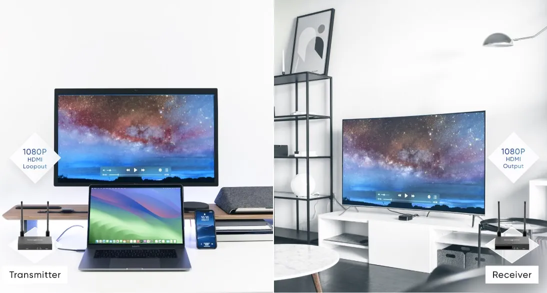 HDMI video and audio transmission via wireless WIFI, up to 200 meters;